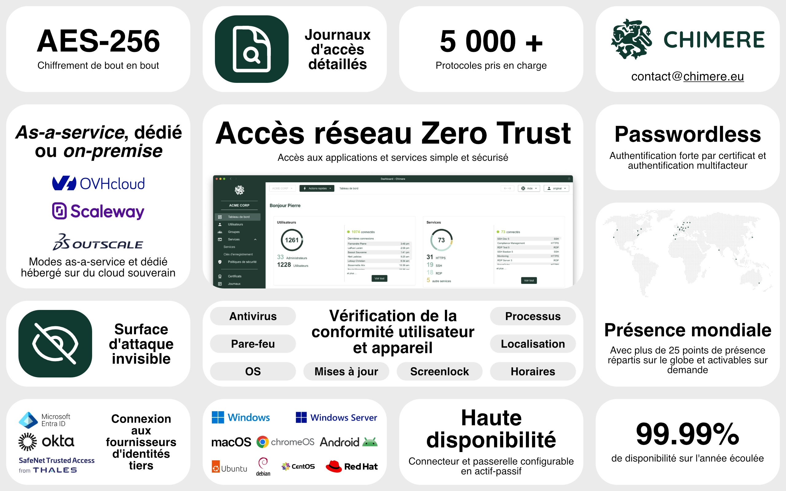 Chimere est une solution d'accès à distance de nouvelle génération basée sur le Zero Trust Network Access qui fournit un accès sécurisé et privé à vos applications et services.